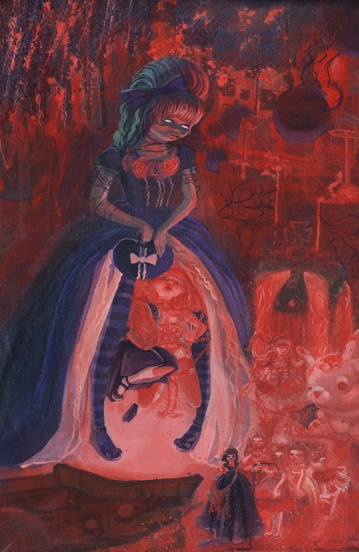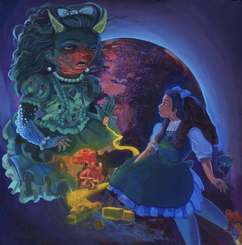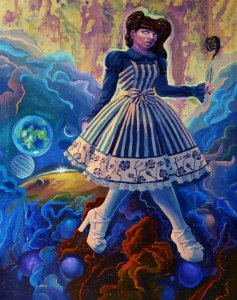 And I thought his work was stunning. These pictures are not done with computer but the old-fashion way, by hand and with talent. Everything is acrylic on canvas and they are so marvelously stunning. I love the detail that he has an amazing eye for and most importantly, the figures are diverse in skin, body, expression and theme. There is plenty of lolita art out there but usually the subject is White and doesn’t often stray from that or if so, more in a tokenized fashion than anything. Atra_mental mentions about his artwork, “Someone asked me why I paint space with the figures and I said because space is full of magic, creation and beauty.” Good answer