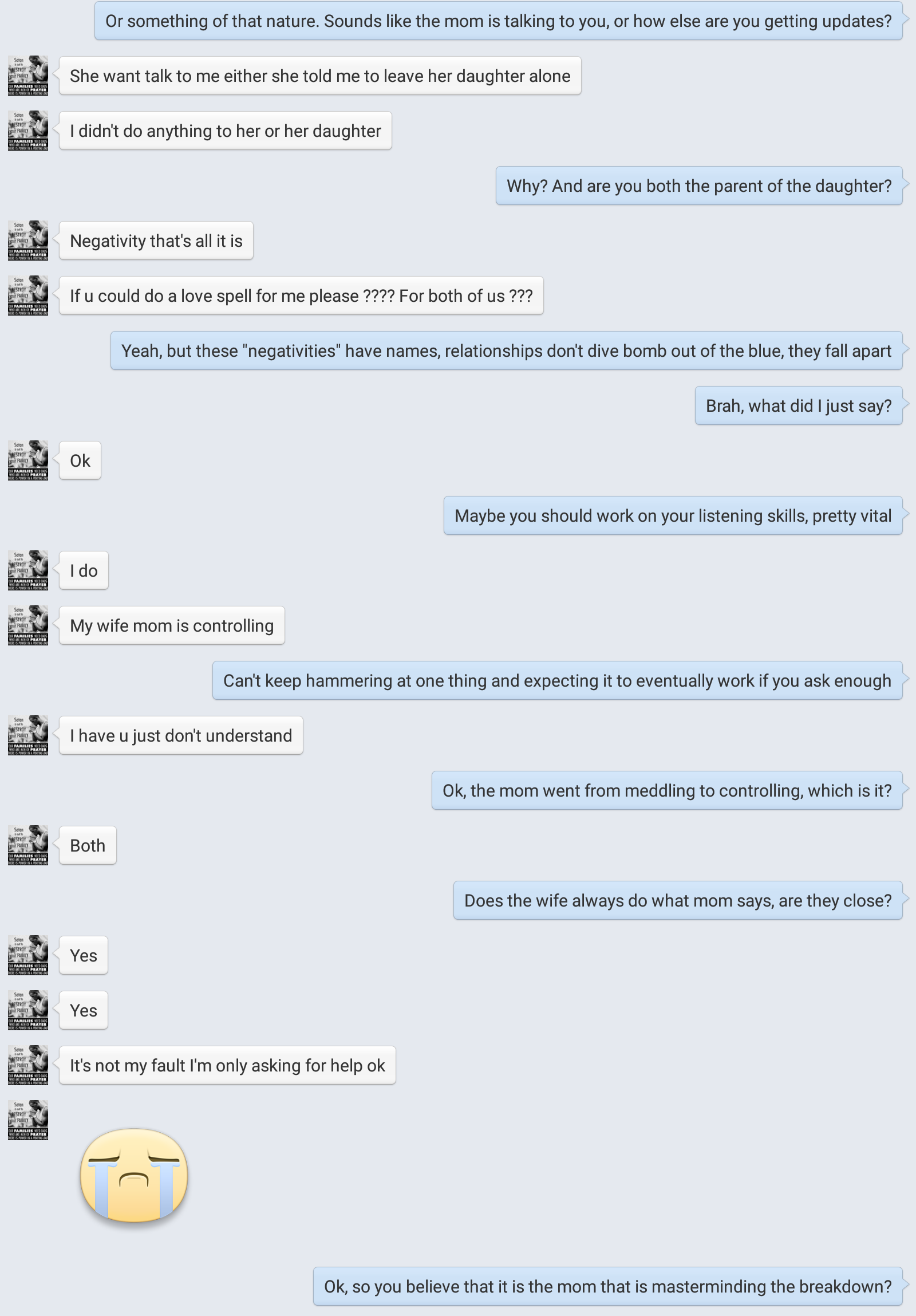 Ok, I have no idea why the sudden PMSing. Not doling out spells doesn’t make me “least helpful”, not everything needs magick to solve regular problems. It’s almost like asking me to craft a potion to remove a stain from your shirt and getting into a fit when I suggest “Try laundry detergent”. Everyone, yes, I’m a witch but I’m a person, too. And how was I supposed to know that he’s LGBT with zip, zero, zilch signifiers? Without any other colloquial identifiers (slang, basically), how the heck am I supposed to know? Remember, on the internet, no one knows who you are. This is why the saying “The Internet:Men are Men, Women are Men and Children are the FBI” still rotates around. This says nothing of the bunches of times the dude says “girl” in emo frenzy.