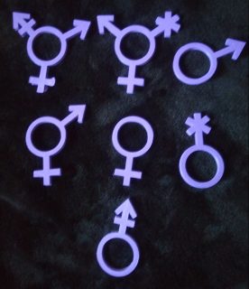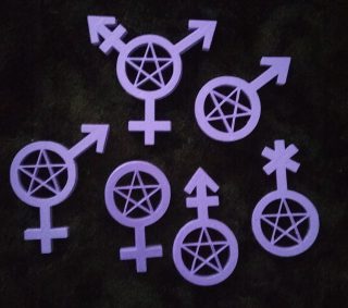The BW Shoppe has a vast array of gender symbols that can be turned into keychains, key charms, whatever. There are four versions: one with a hole at the top for keychains and phone charms; one with no hole at all; one with a pentacle in the middle; one with no pentacle at all.