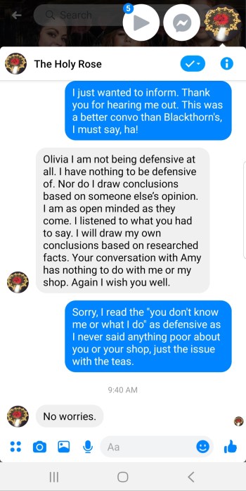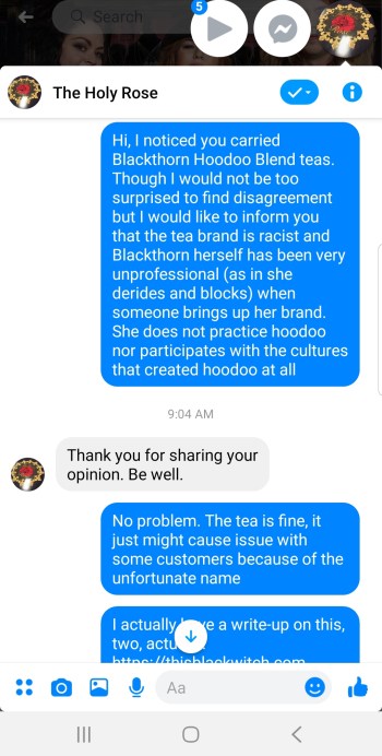 Look, I get that The Holy Rose wants to be emo because actual accountability is difficult. The smart thing they should have done would be to be more receptive instead of offer a bland “thank you for your opinion”. That’s where they screwed up. Blackthorn likes making money off of the idea of Black experiences as a White person in Paganism, that’s her thing. As a shop, you can easily tell a product line you carry “Hey, I got some unsavory news about you. We’re not sure if we can still carry you because the name could cause fall out and we’re not Amazon or Walmart, maybe we could work this out?” This is a Pagan marketplace, finding tea sellers and makers is not that hard.