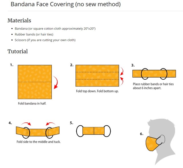 Masks: Wear one. Not surgical ones, though, unless you are a healthcare worker. Here is a how to guide from the CDC about making a mask out of a bandanna and hair ties.