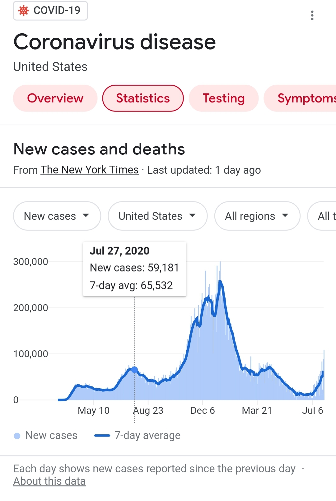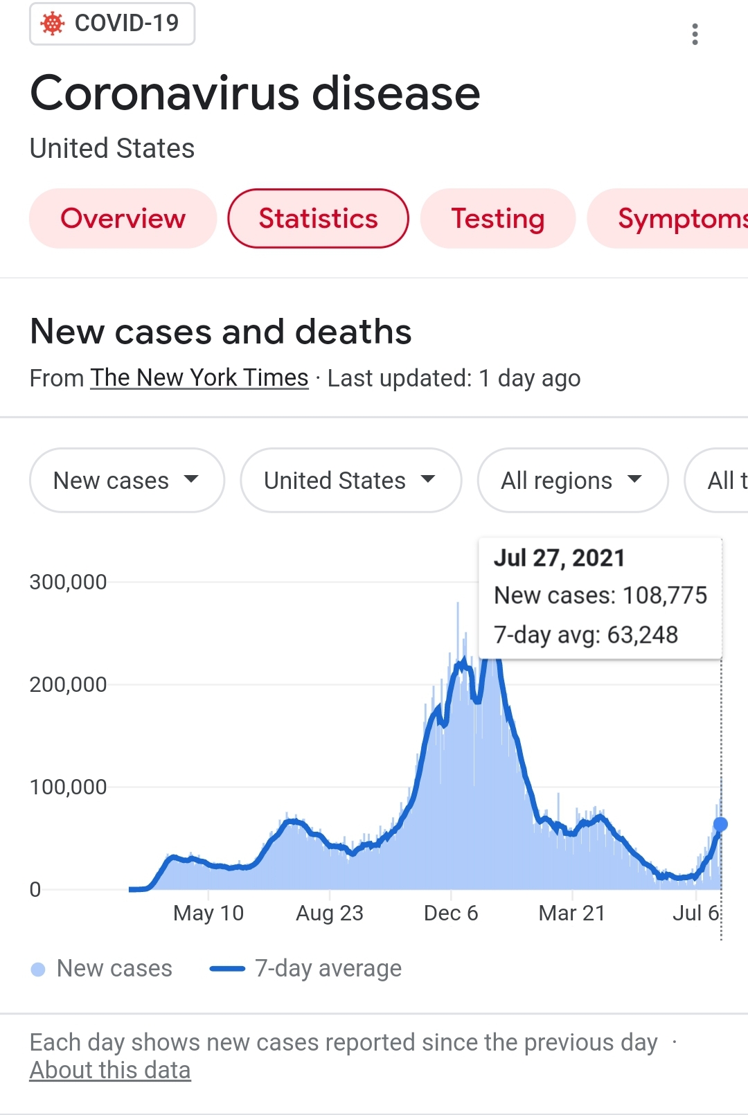 Please note that on July 27, 2020, when there was no vaccine and people were still getting used to the pandemic restrictions, the number of confirmed infections (remember, not everyone was getting tested and testing centers were patchy at best) were 59,181. That’s pretty darn bad. Then you look at this year’s number, when there is a vaccine, the pandemic mandates have been in place for over a year, yadda yadda yadda: 108,775 confirmed infections.
