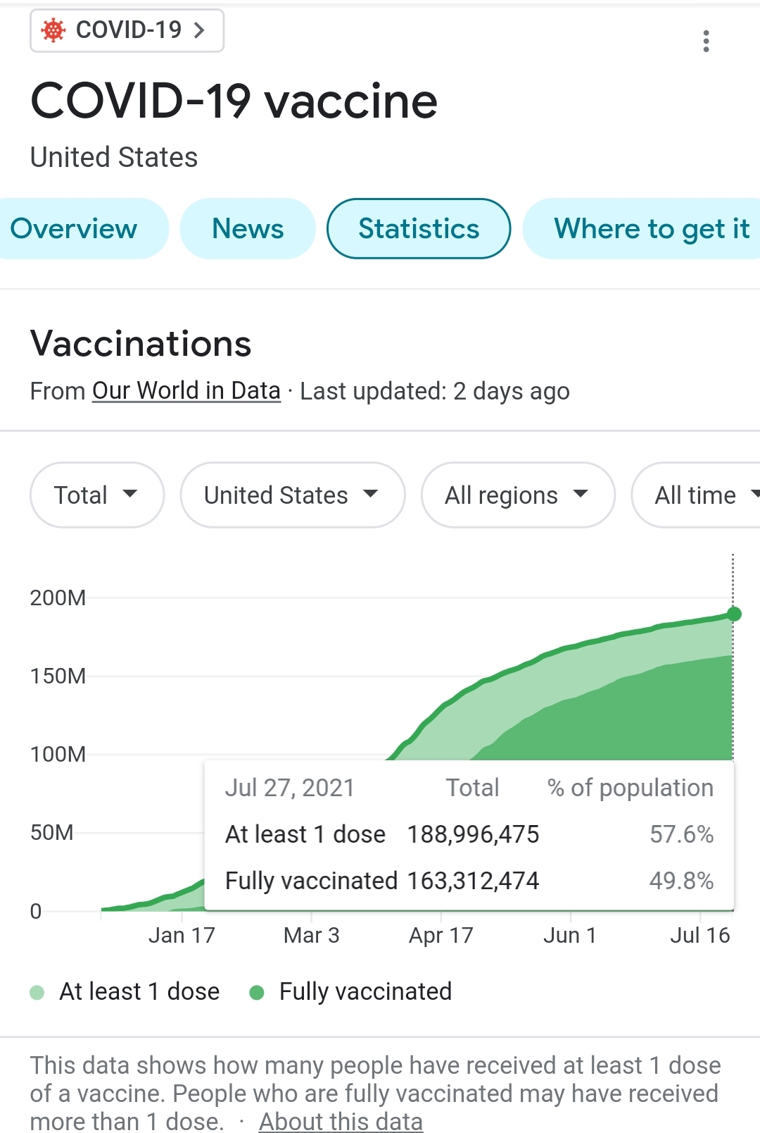 The part that is most important is the “Fully Vaccinated” number. For Covid-19, the vaccination number has to be at 70% minimum for herd immunity. That number currently stands at 49.8%, as of July 27, 2021. Also, please note that the vaccination curve is flattening. When health officials said “let’s flatten the curve”, this wasn’t the curve they were talking about. There are a lot of people who are half vaccinated, and that’s great, hopefully that will bode good things in the future – but the thing is, half vaxxed is not fully vaxxed. Half means there is roughly a 33% chance of defending against Covid, instead of the upper 80s and 90 percents. Half also means that the coronavirus has a perfect testing ground to learn how to navigate vaccinated bodies, period. That’s how we get variants/mutations.