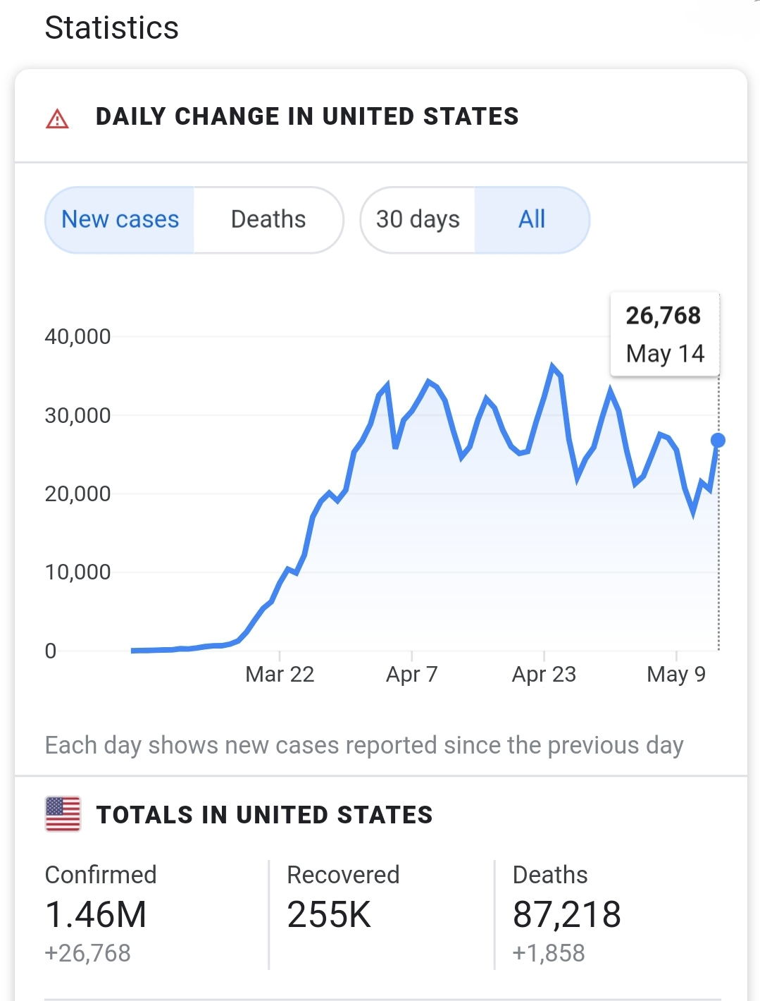 Graph goes up to May 14. USA had 19,731 cases on May 17th, yesterday. This is not improvement.