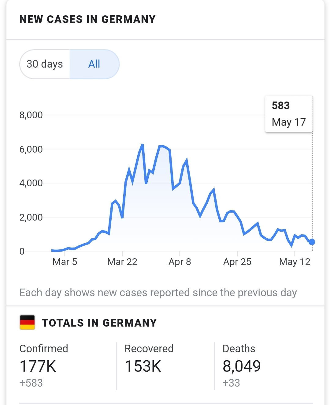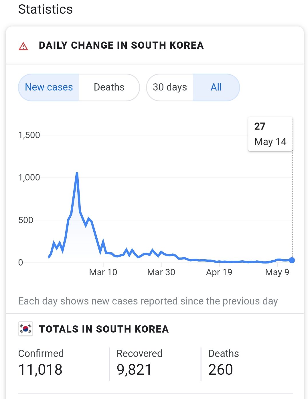 This is what their graph looks like, obtained by Google by simply searching “Coronavirus in S. Korea” (you can also do the same for every country and state).